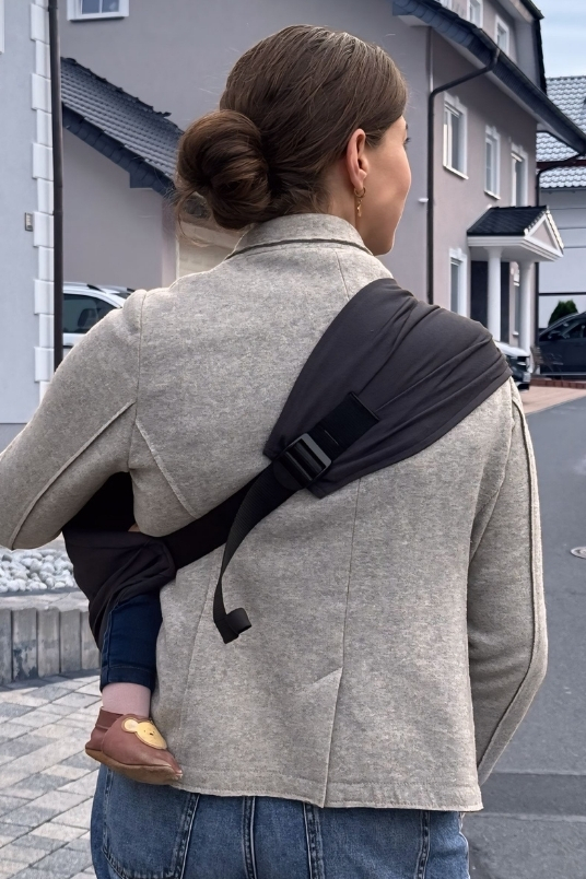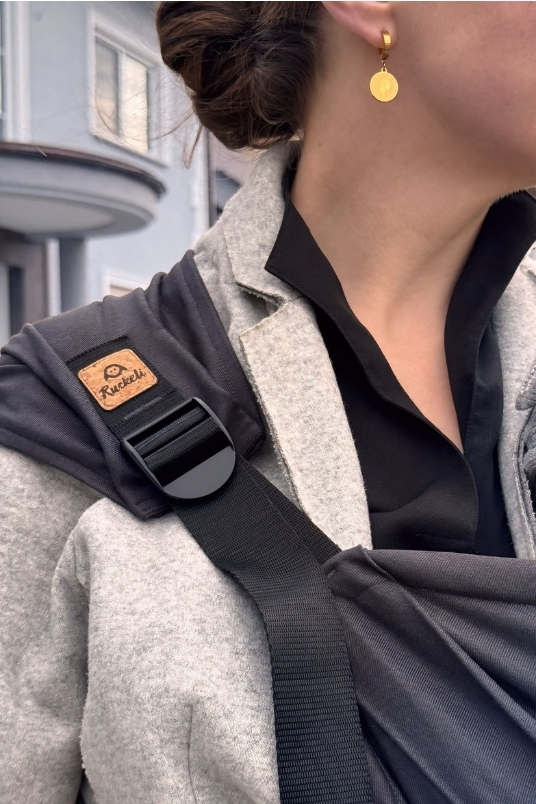 Mit nur zwei Schnallen sitzt die Trage in Sekunden: eine vorne, eine hinten. Der weiche Stoff fächert sich dabei automatisch auf deiner Schulter auf und verteilt das Gewicht angenehm – ohne Druck auf die Nackenmuskulatur. So wird Tragen auch auf längeren Wegen bequem.